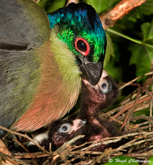Purple-crested Turacos feed their ugly black chicks almost entirely on regurgitated fruit pulp.
