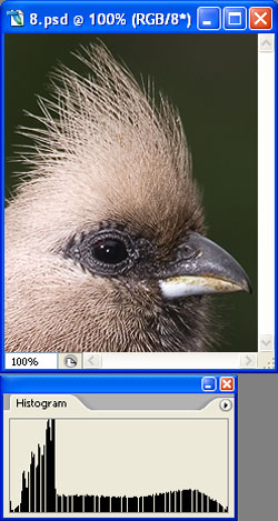 the 8bit file (left) and 16bit (right) with the same levels adjustment. Notice the pictures look identical but a look at the histograms below shows graps in the 8 bit files histogram showing loss of data caused by the levels adjustment and no gaps in the 16bit file.