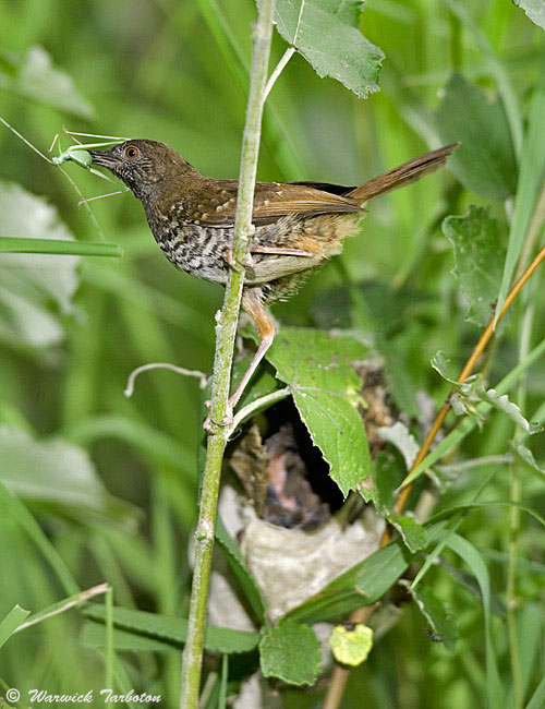 Adult Barred Wren-Warbler delivering prey to chicks in the nest
